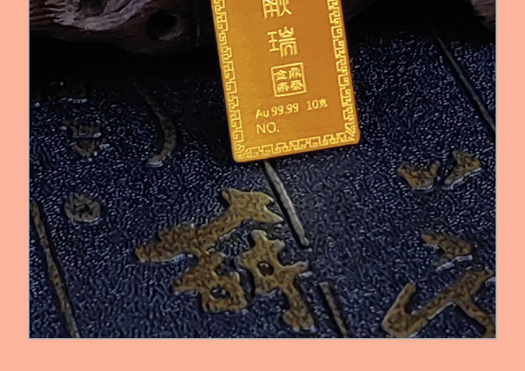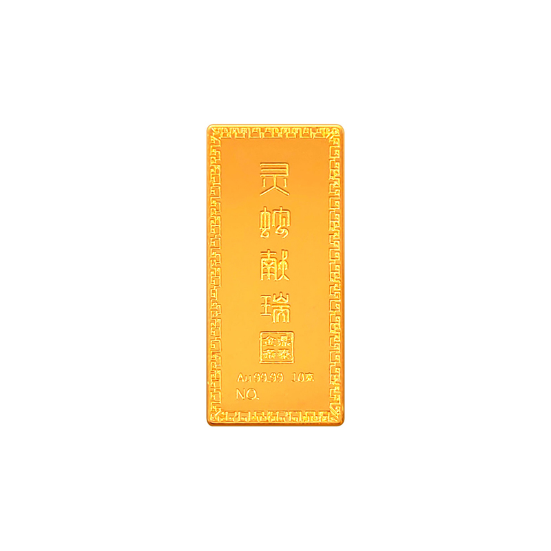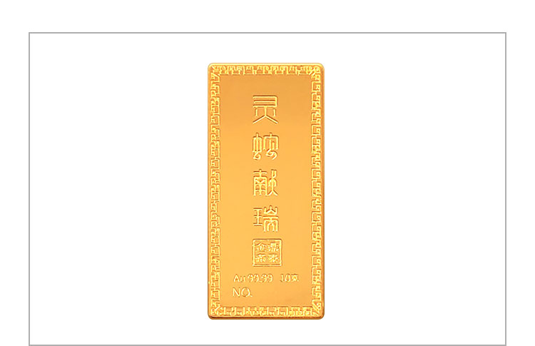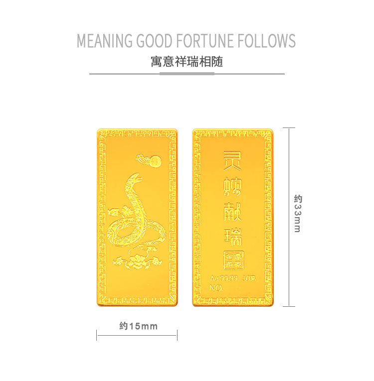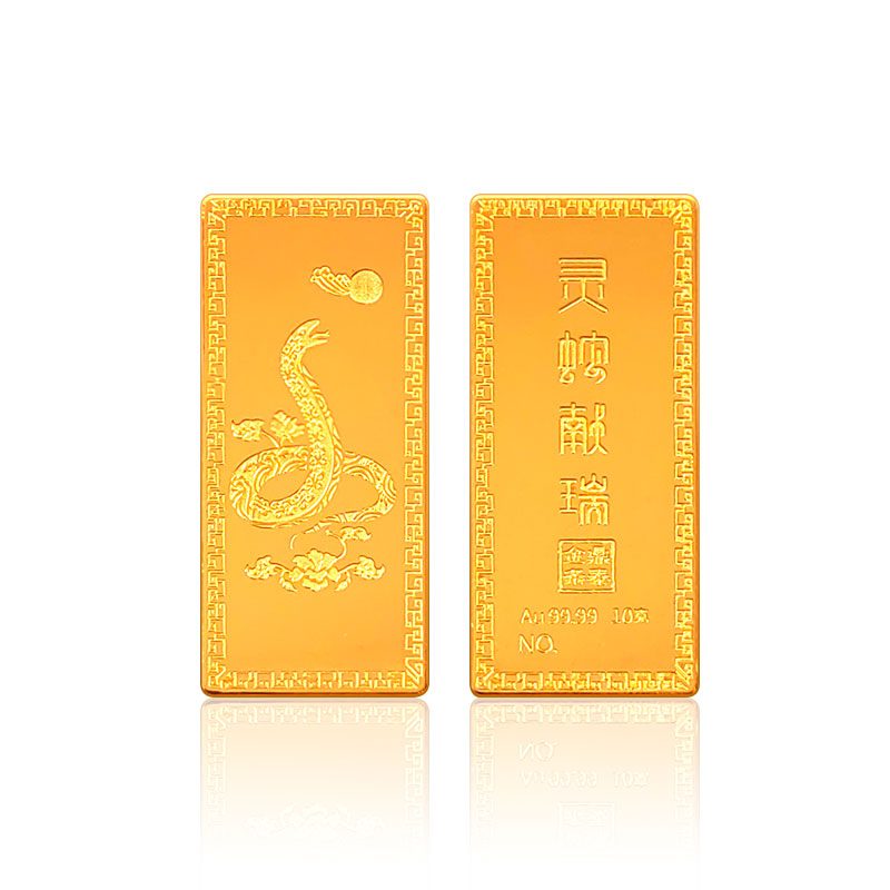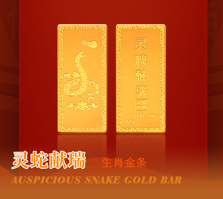 靈蛇獻(xiàn)瑞10克生肖金條,正面為一條盤繞花叢,望月昂首的金蛇造型。金蛇身披圖案為代表神圣的蟠虺紋、明月,代表健康長壽的東海水和鯨魚紋,代表財(cái)富的金錢樹紋和周圍的牡丹圖案,此謂靈蛇獻(xiàn)瑞主題。整體設(shè)計(jì)寓意增長學(xué)識(shí)與能力,財(cái)源通達(dá),健康長壽的美好祝愿。