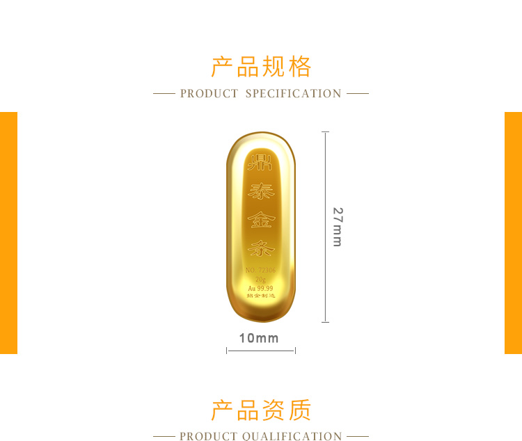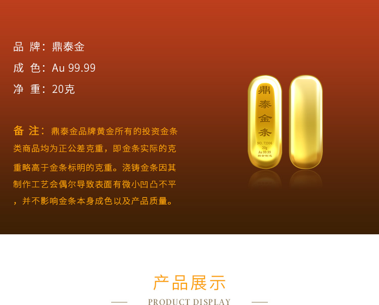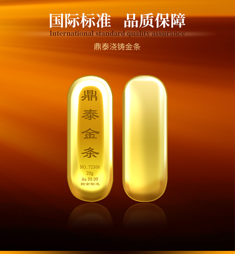 出品品牌為“鼎泰金”,經(jīng)澆鑄工藝制作,外觀圓潤(rùn),色度飽滿,全流程嚴(yán)格按照上海黃金交易所標(biāo)準(zhǔn)制造完成,支持購(gòu)回。金條正面標(biāo)注成色、克重、編號(hào)等標(biāo)識(shí)。