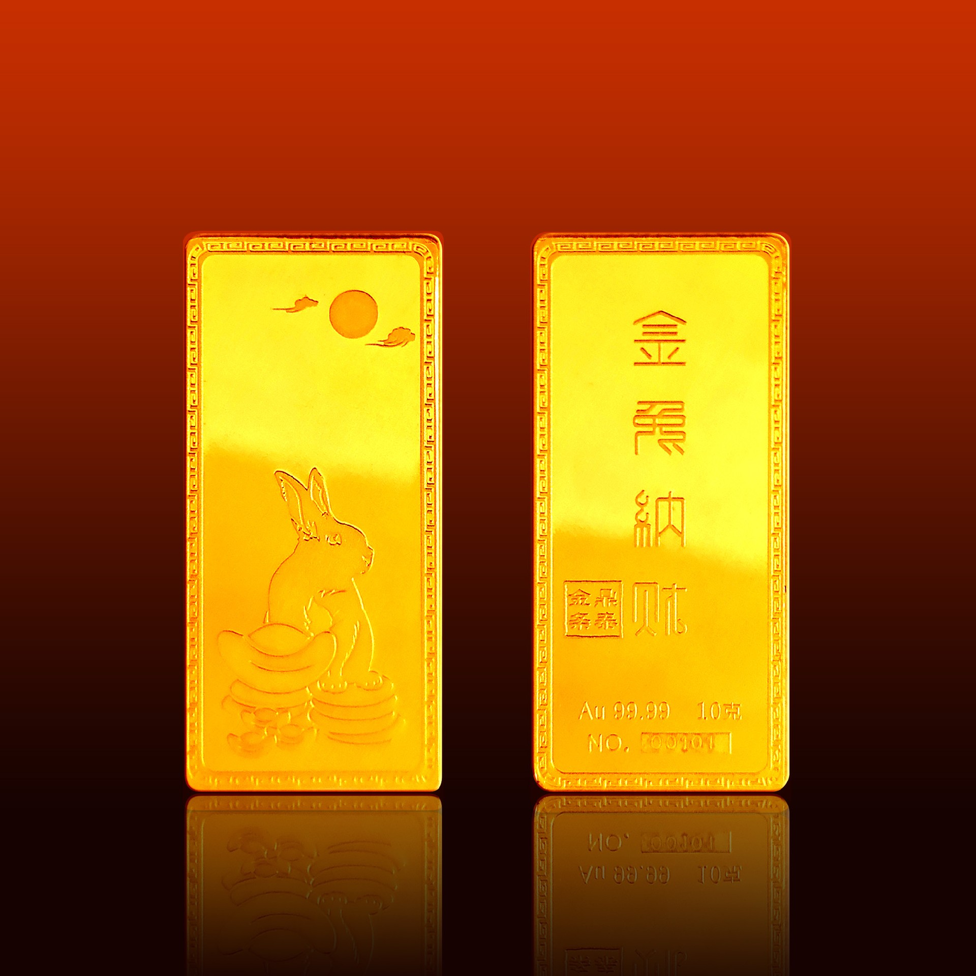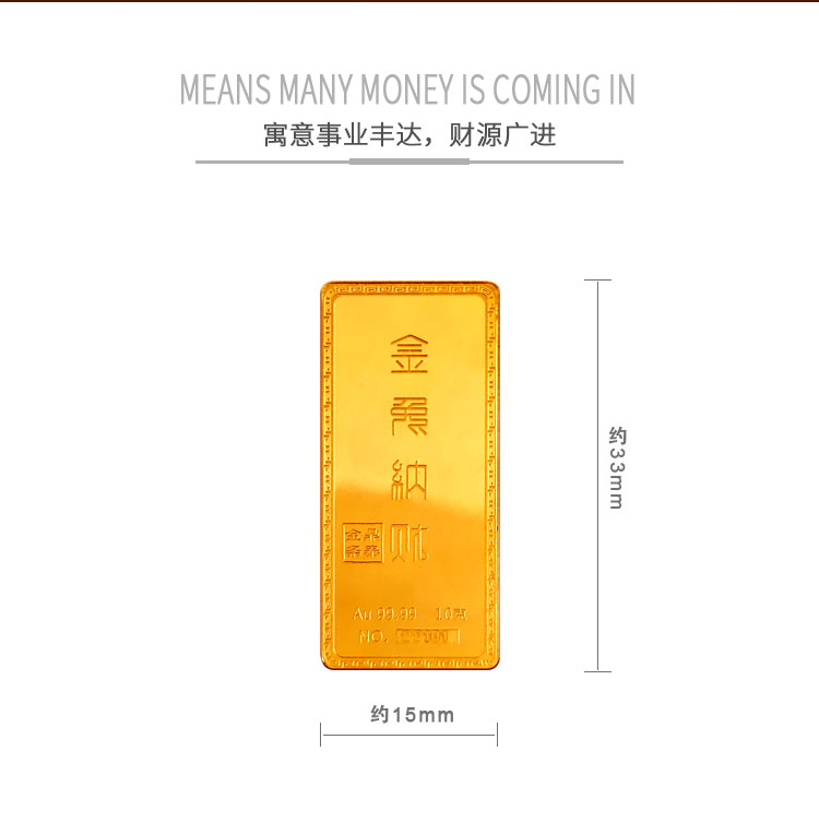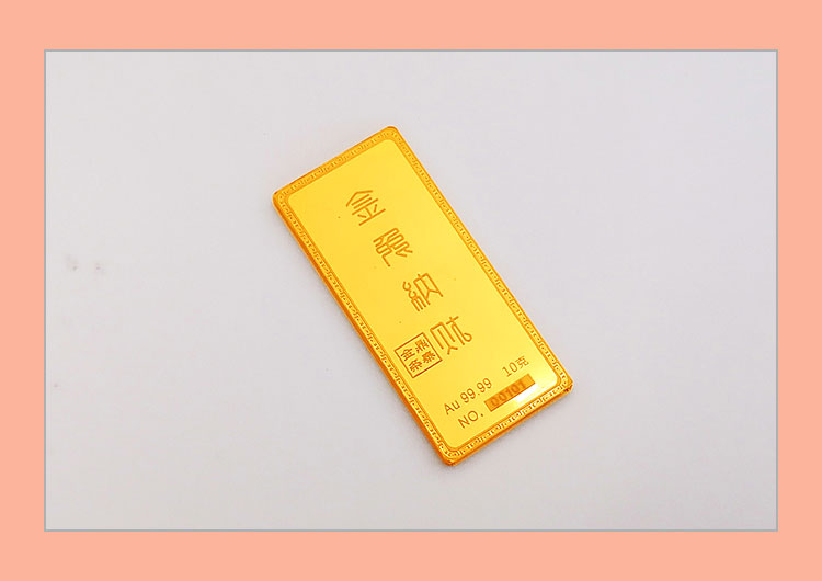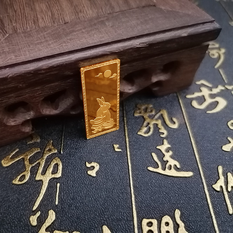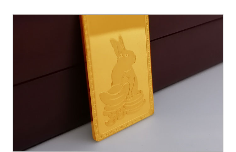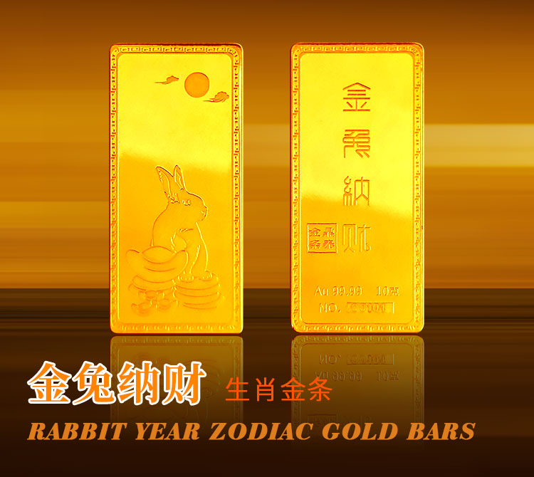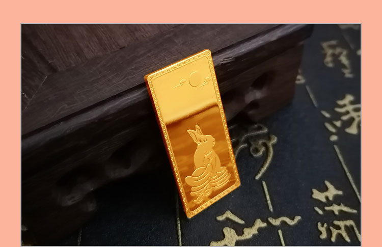 金兔納財(cái)系列金條產(chǎn)品,采用油壓工藝制造。正面圖案為一只兔子蹲坐于金錢(qián)堆上,面前擺放起元寶的造型,兔子形態(tài)機(jī)敏警惕,頭頂有環(huán)繞祥云的明月照耀。反面金兔納財(cái)四字居中,鼎泰金條印章在旁,下方標(biāo)注有金條成色、克重、編號(hào)等。整體設(shè)計(jì)寓意理財(cái)有道,納財(cái)有方,事業(yè)豐順,受福祿而身心靈動(dòng)安康,鴻福綿長(zhǎng)的美好祝愿。金條整體為鏡面底,圖案采用浮雕細(xì)砂工藝,對(duì)比效果清析,十分美觀。