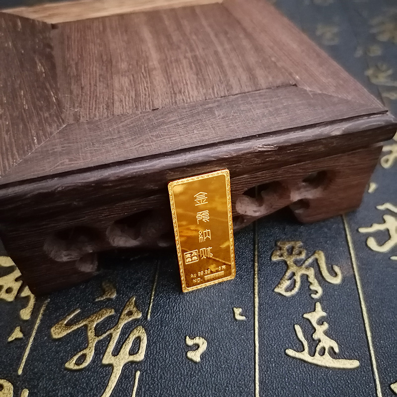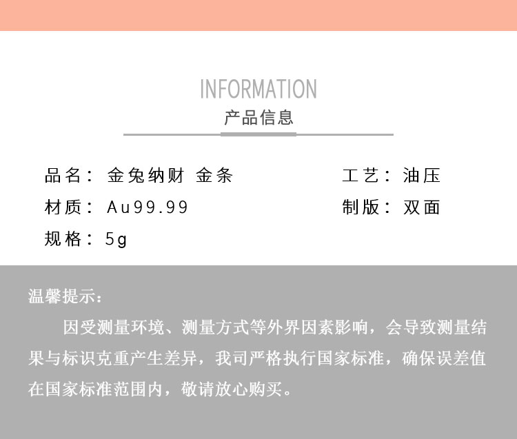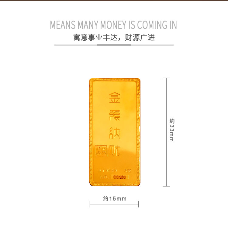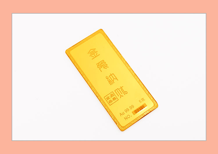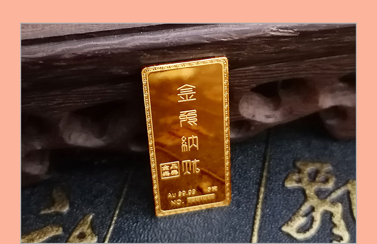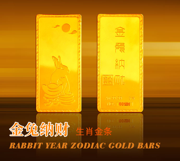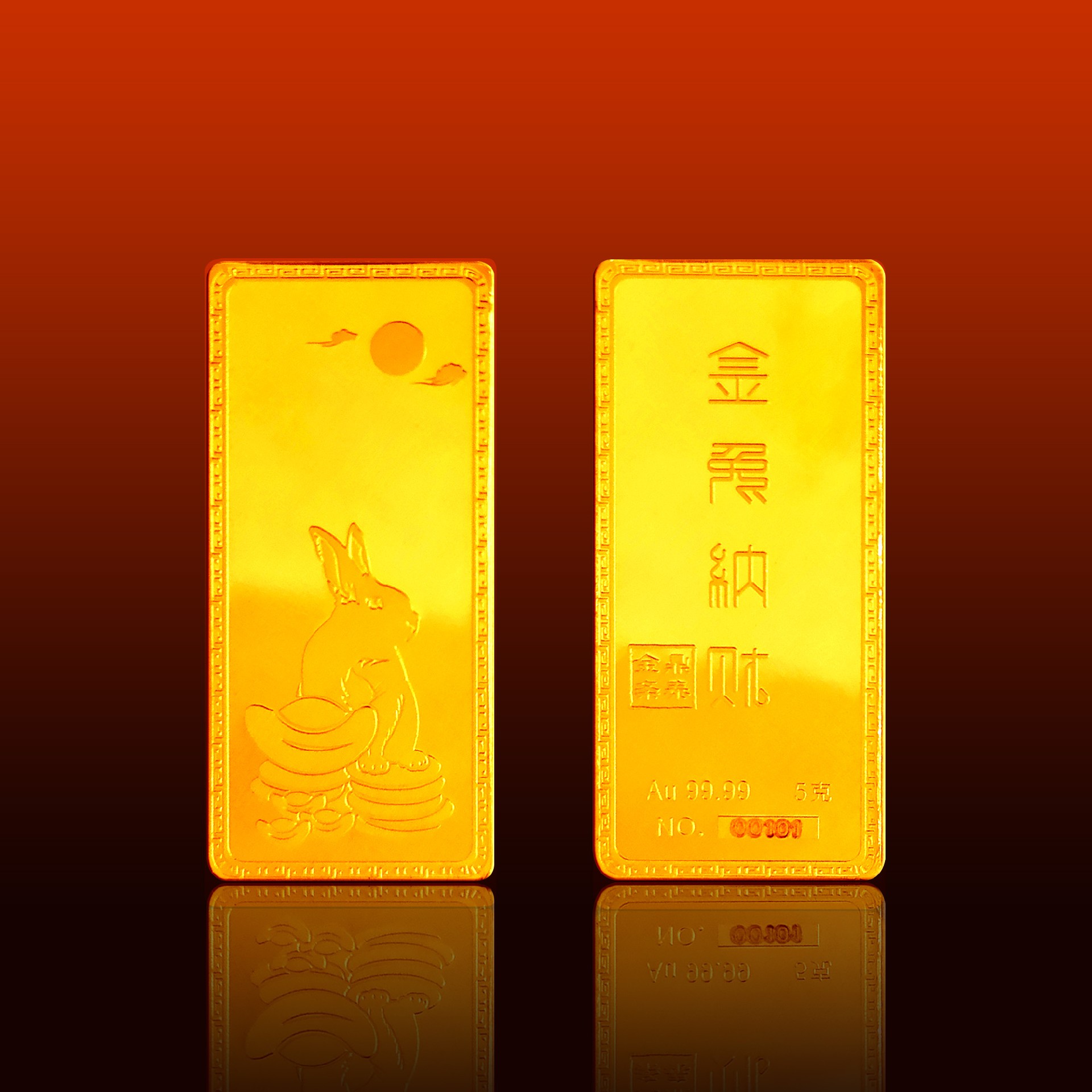 金兔納財系列金條產(chǎn)品,采用油壓工藝制造。正面圖案為一只兔子蹲坐于金錢堆上,面前擺放起元寶的造型,兔子形態(tài)機敏警惕,頭頂有環(huán)繞祥云的明月照耀。反面金兔納財四字居中,鼎泰金條印章在旁,下方標(biāo)注有金條成色、克重、編號等。整體設(shè)計寓意理財有道,納財有方,事業(yè)豐順,受福祿而身心靈動安康,鴻福綿長的美好祝愿。金條整體為鏡面底,圖案采用浮雕細砂工藝,對比效果清析,十分美觀。