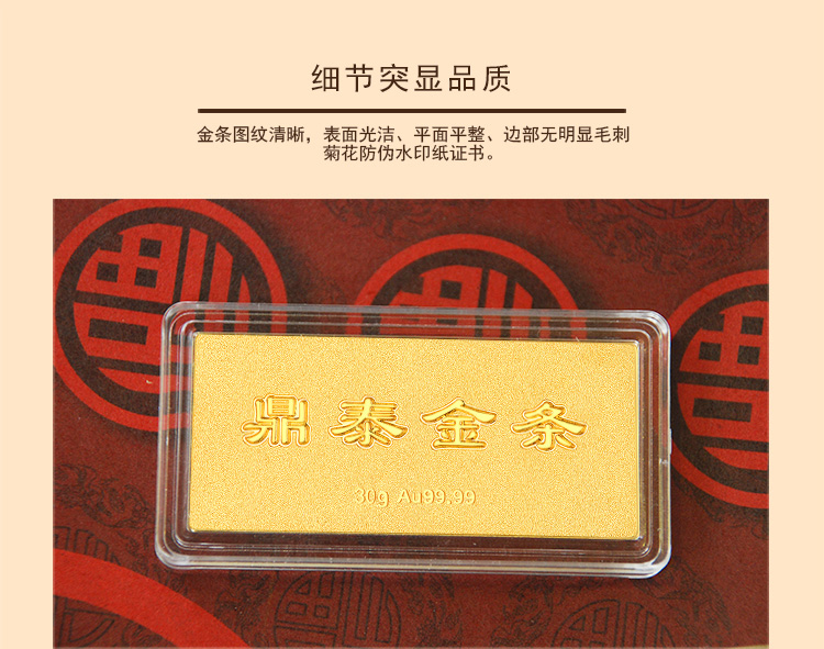 磨砂橫版采用了細磨砂、鏡底、油壓工藝。金條整體圖案文字清析,外形規(guī)整,表面磨砂顆粒觸感細膩,邊角平順。