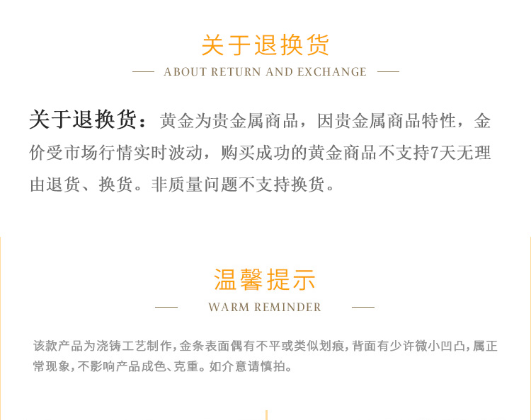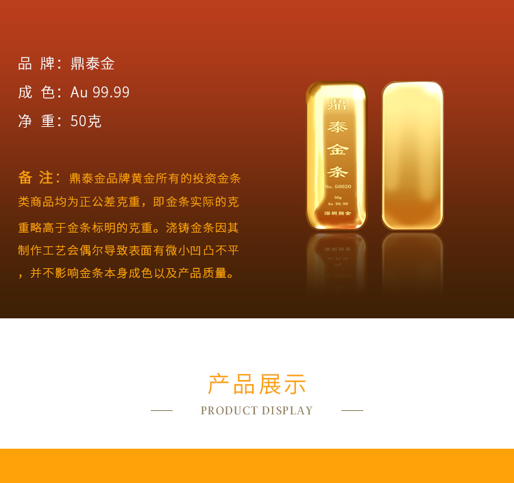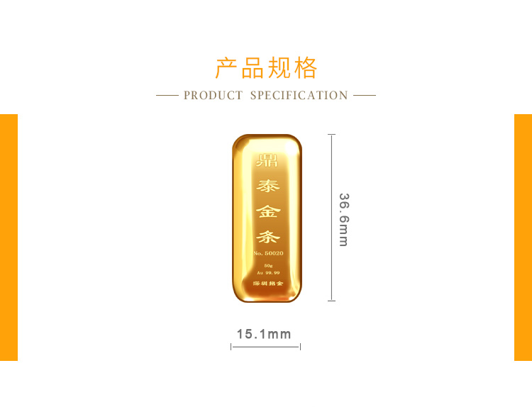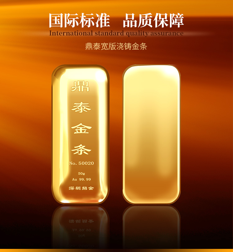 出品品牌為“鼎泰金”,經(jīng)澆鑄工藝制作,外觀圓潤,色度飽滿,全流程嚴(yán)格按照上海黃金交易所標(biāo)準(zhǔn)制造完成,支持購回。規(guī)格尺寸上分為經(jīng)典澆鑄款、寬版澆鑄款。金條正面標(biāo)注成色、克重、編號等標(biāo)識。