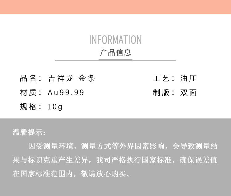 吉祥龍生肖金條以云中行龍,龍游云從為設(shè)計主題,采用油壓工藝制造。金條正面主體為祥云之間的一條金龍,游走于云海之中睥睨天下的造型。龍形為下探游龍,,身姿彎蜒,健美有力。身邊為祥云簇擁環(huán)繞,鱗甲飛揚。反面吉祥龍三字居中,四周回角邊,下方標注有金條成色、克重、編號等。整體設(shè)計寓意龍行天下,財通八方,事業(yè)興旺發(fā)達的美好祝愿。