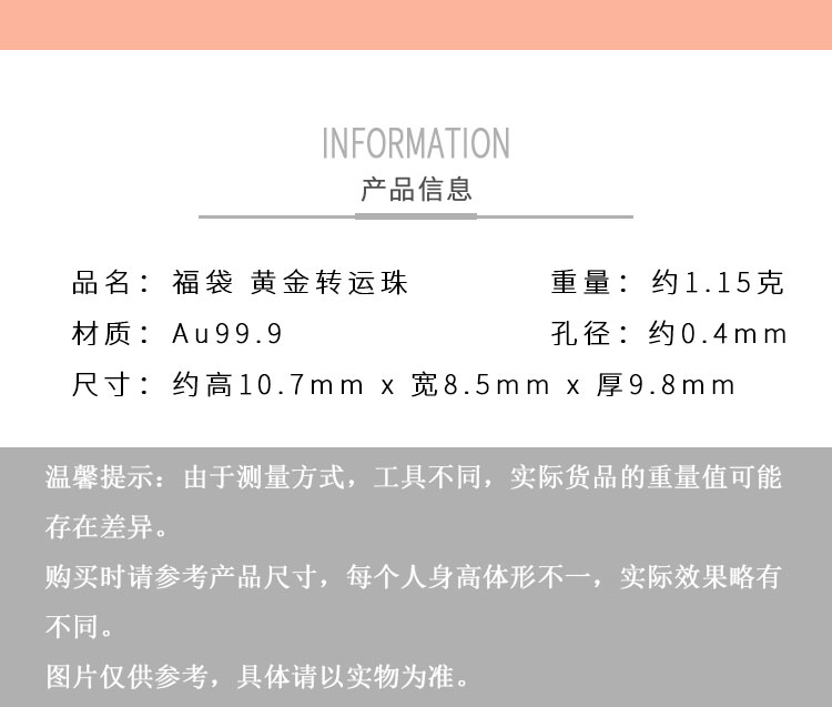 黃金轉(zhuǎn)運(yùn)珠佩戴時(shí),隨著肢體動(dòng)作不停轉(zhuǎn)動(dòng),寓意為佩戴者時(shí)時(shí)轉(zhuǎn)運(yùn),使這好運(yùn)隨身。