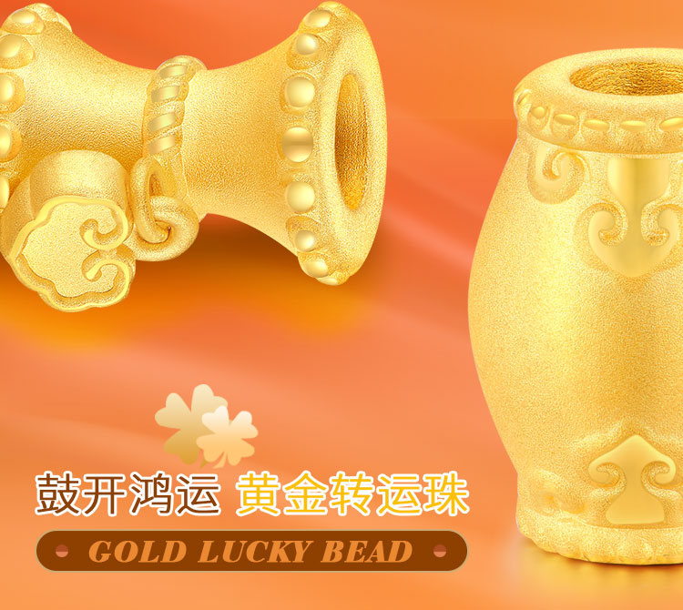 黃金轉(zhuǎn)運(yùn)珠佩戴時(shí),隨著肢體動(dòng)作不停轉(zhuǎn)動(dòng),寓意為佩戴者時(shí)時(shí)轉(zhuǎn)運(yùn),使這好運(yùn)隨身。